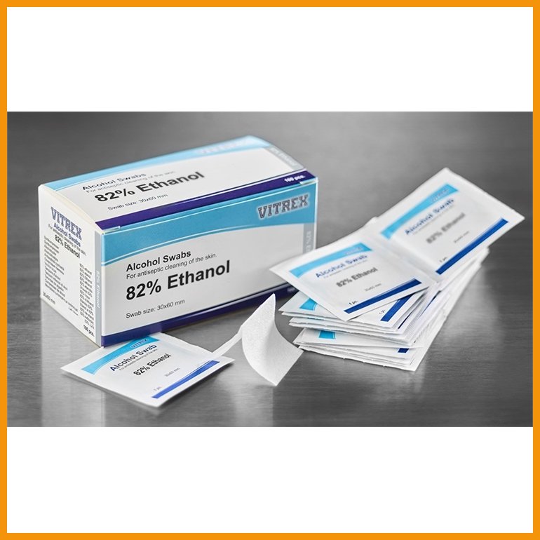 Vitrex-injektiopyyhe soveltuu ihon antiseptiseen puhdistukseen ennen rokotusta tai verinäytteen ottoa. Kertakäyttöinen, kaksikerroksinen pyyhe sisältää 82 % etanolia.Mitat: 3 x 6 cm