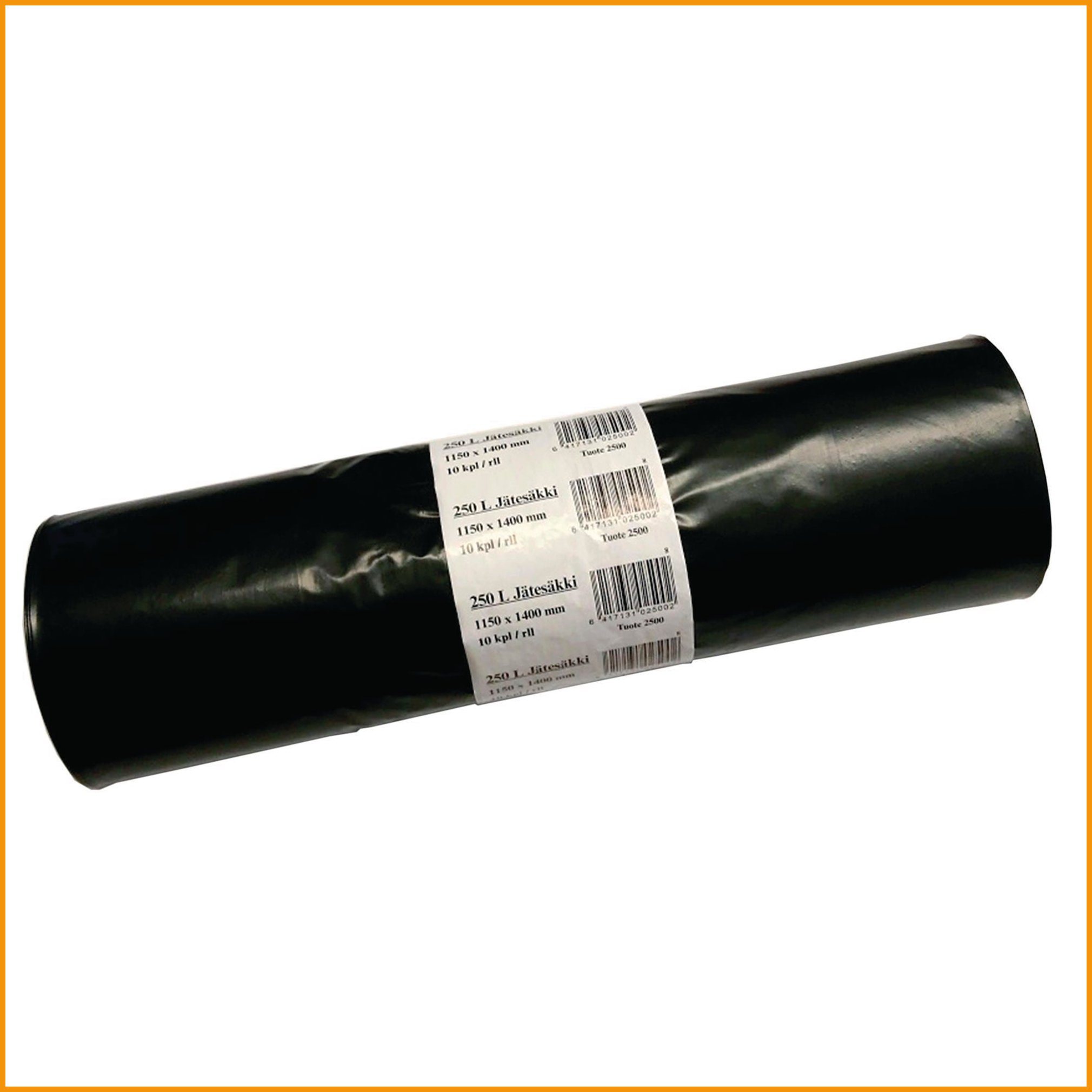 Musta ja vahva 250 litran jätesäkki sopii raskaammallekin jätteelle. Jätesäkin mitat ovat: 115 x 140 cm paksuus: 0,06 mm rullassa on 10 säkkiä. laatikossa 8 rullaa. lavalla 40 laatikkoa.Jätesäkit toimitetaan 10 kappaleen erissä.