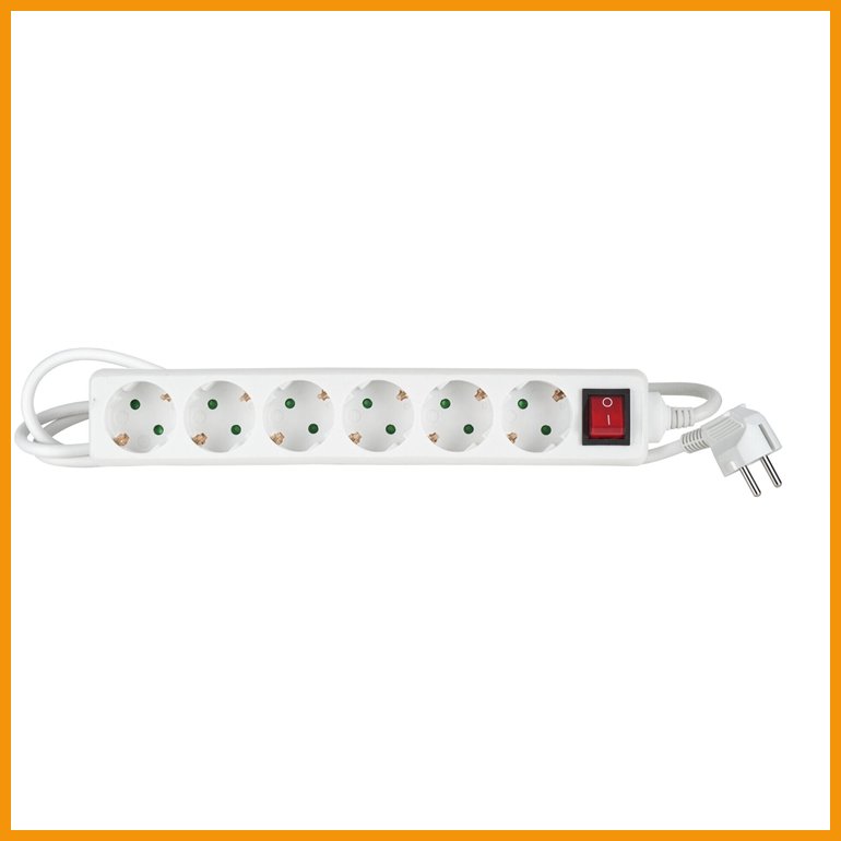 Airamin maadoitettu ja lapsisuojattu, kytkimellä ja merkkivalolla varustettu 6-osainen jatkojohto sisäkäyttöön. Pistokkeet ovat 45 ° kulmassa.Johdon pituus: 5 m