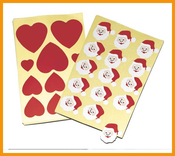 Playboxin joulupukki- ja sydäntarroilla somistat kauniisti joulukortit ja -koristeet.