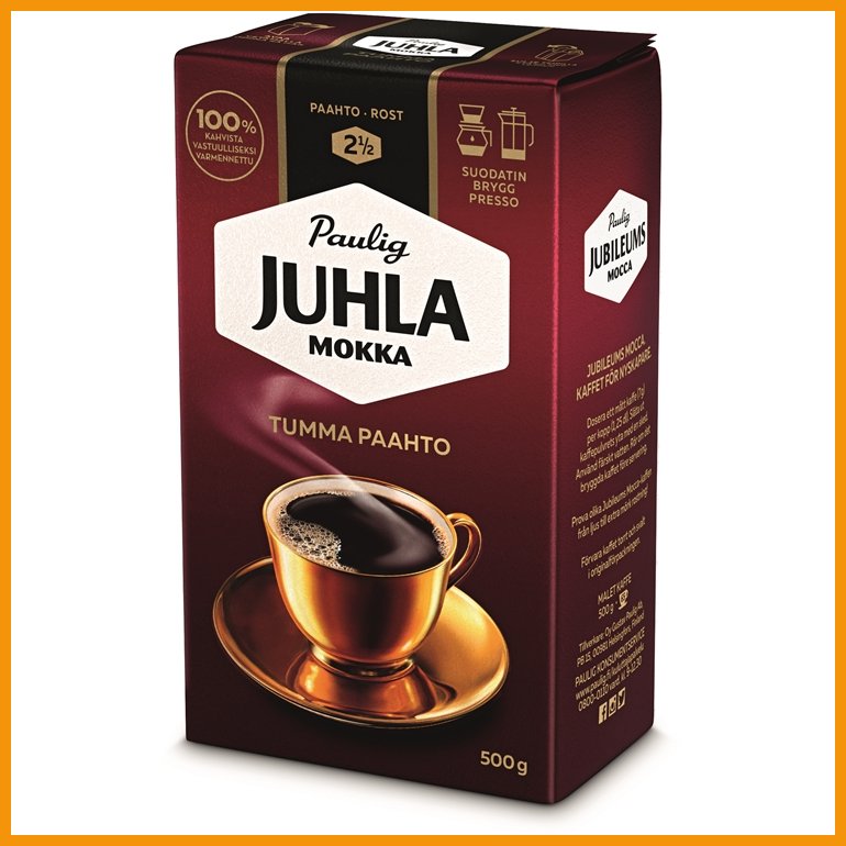 Juhla Mokka on Suomen suosituin kahvi. Tässä ikisuosikki tummapaahtoisena. Pauligin raikas ja marjaisa kahvi valmistetaan parhaista Keski- ja Etelä-Amerikan ja Afrikan arabicalaaduista. Hieno suodatinjauhatus.Paahtoaste: 2,5
