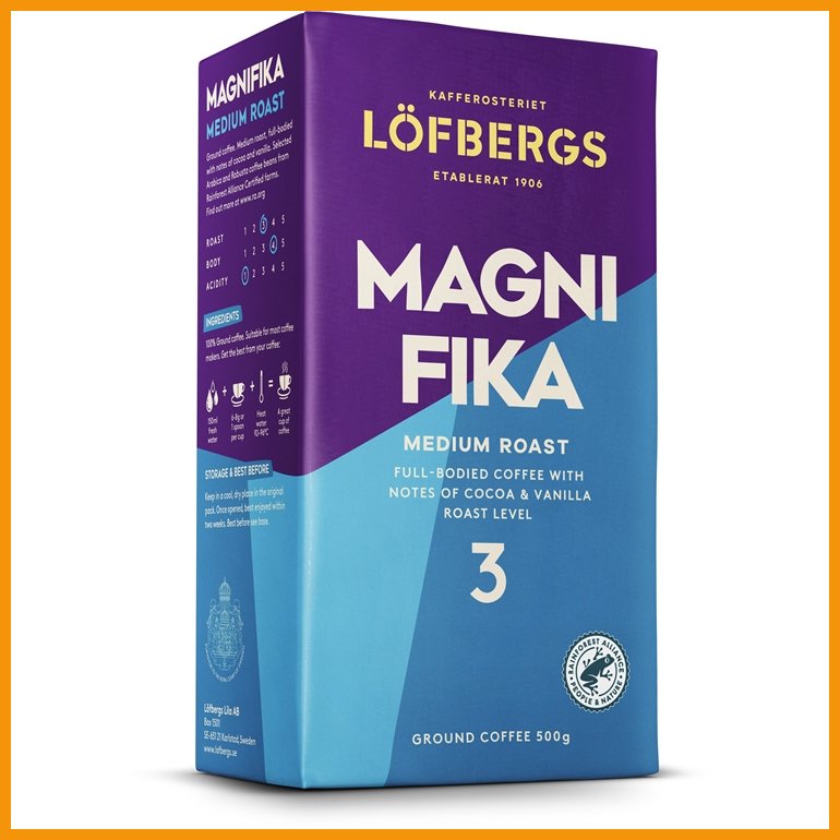 Löfbergs Magnifika on keskitummapaahtoinen ja erittäin vähähappoinen kahvi, jonka makua on pyöristetty kaakaolla ja vaniljalla. Kestävästi valmistetulla arabica- ja robustakahvien sekoituksella on Rainforest Alliance -sertifikaatti. Suodatinjauhatus.Paahtoaste: 3