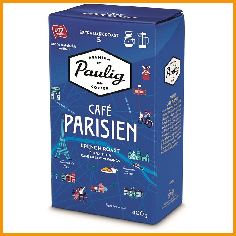 Pauligin Café Parisien on ranskalaiseen tapaan erittäin tummaksi paahdettu kahvisekoitus. Todella täyteläinen ja aromikas kahvi voidaan valmistaa sekä perinteisellä suodatinlaitteella että pressopannulla. Kestävästi valmistetulla tuotteella on Rainforest Alliance -ympäristösertifikaatti. Suodatinjauhatus.Paahtoaste: 5
