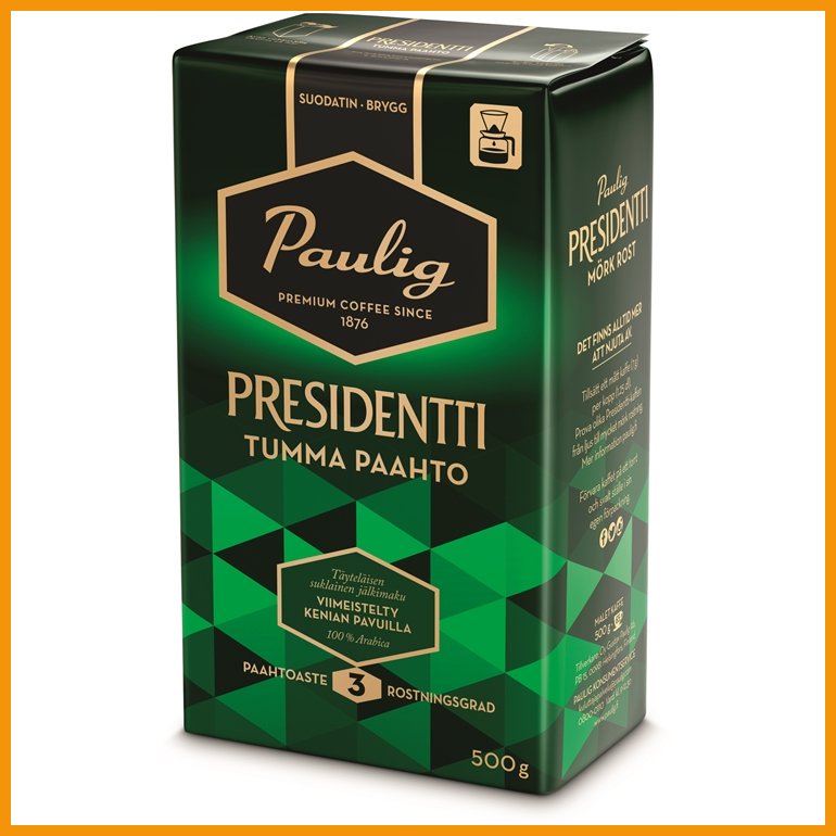 Pauligin Presidentti Tumma Paahto on lähes satavuotias klassikkokahvi. Tummapaahtoinen ja suklaisella jälkimaulla siunattu kahvi on täyteläinen ja aromikas. Kestävästi valmistettu tuote on Rainforest Alliance -sertifioitu.Paahtoaste: 3