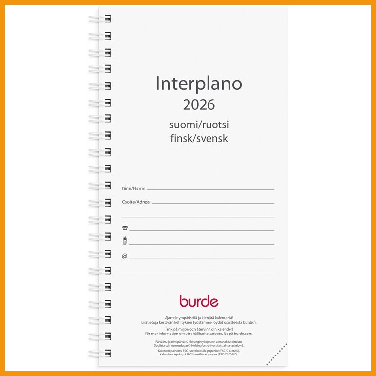 Kalenteri 2026 Interplano vuosipaketti suomenkielinen/ruotsi on hyvälaatuinen kalenteritarvike, jonka toimituksen kesto on verkkokaupasta tilattuna 1-2 päivää. Huomaa, että toimitus on ilmainen yli 140 € hintaisille verkkokauppa ostoksille! Meiltä voit tilata laskulla ja ilman rekisteröitymistä.