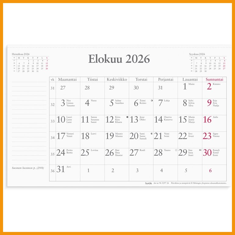 Burden Kuukausikalenterin (hiirimaton refill) aukeamalla on kuluvan kuukauden lisäksi edellisen sekä tulevan kuukauden kalenteritaulukot. Kuukausikalenterilla varustetun hiirimaton sisään sujahtava kalenteri sisältää nimipäivät, kuun vaiheet, liputuspäivät ja kansalliset pyhäpäivät.Tuote on valmistettu FSC-sertifioidusta materiaalista.