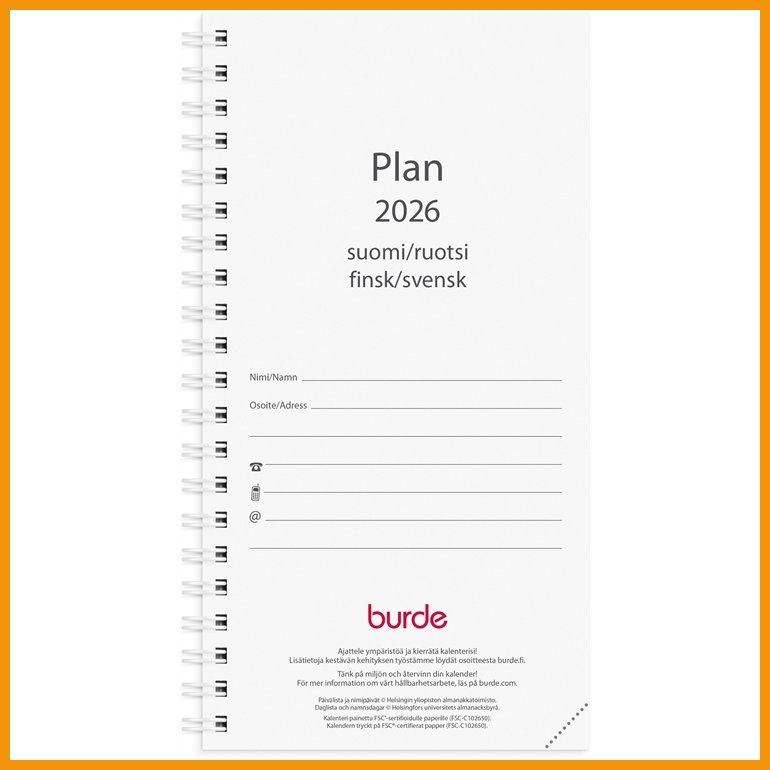 Kalenteri 2026 Plan vuosipaketti (kaksikielinen) on upea kalenteritarvike, jonka verkkokauppatilauksen toimitus perille kestää 1-2 päivää. Tiedäthän, että ilmainen toimitus on kaikilla yli 140 € hintaisilla tilauksilla! Meiltä voit tilata laskulla ja ilman rekisteröitymistä.