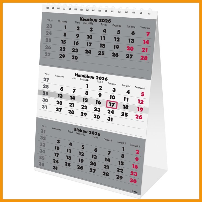 Burden Triplaner on helposti koottava pöytäkalenteri vuodelle 2026, joka vie vain vähän tilaa. Kalenterissa on 12 sivua, joista jokaisella näkyy kolmen kuukauden kalendaario, jossa kuluva kuukausi löytyy keskeltä. Mukana tulee myös siirrettävä päiväosoitin.Tuote on valmistettu FSC-sertifioidusta materiaalista.