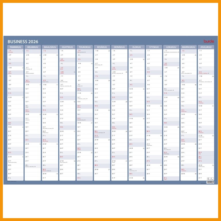 Burden Seinälehti Business on suurikokoinen ja selkeä suunnitelmakalenteri, jossa on muistiinpanotilaa jokaiselle vuoden 2026 päivälle. Kalenteri sisältää liputuspäiviä, valittuja kirkkopyhiä ja juhlapyhiä. Kääntöpuolella on suomen- ja ruotsinkieliset pienennetyt kalenterit.Tuote on valmistettu FSC-sertifioidusta materiaalista.