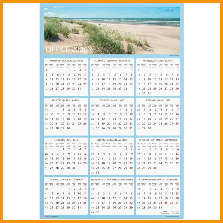 Kalenteri 2026 Seinälehti Office on korkealaatuinen kalenteritarvike, jonka verkkokaupan tilauksen toimitus kestää 1-2 päivää. Muistathan, että ilmainen toimitus on kaikilla yli 140 € hintaisilla tilauksilla! Meiltä voit tilata laskulla ja ilman rekisteröitymistä.