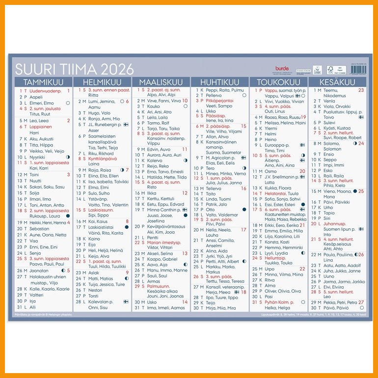 Burden Suuri Tiima on kaksipuolinen, suuri ja selkeä vuoden 2026 kalenteri, jonka toisella puolella on vuoden alkupuolisko tammikuusta kesäkuuhun ja toisella heinäkuusta joulukuuhun. Tukevasta 0,4 mm kartongista valmistettu kalenterisisältää nimipäivät, juhlapyhät, liputuspäivät ja kuun vaiheet.Tuote on valmistettu FSC-sertifioidusta materiaalista.