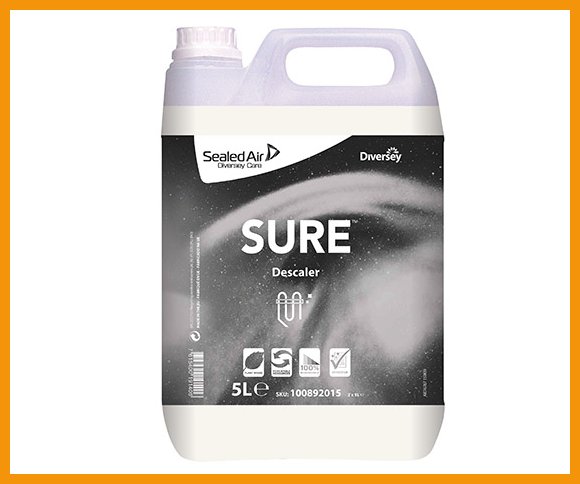 SURE Descaler on biohajoava kalkinpoistoaine. Tiivistetty ja hapan aine sopii keittiökoneiden ja -välineiden, kuten vesihauteiden, boilereiden, höyrynkehittimien sekä kahvin- ja teenkeittimien kalkkisaostumien poistoon. Tuote on valmistettu 100 % uusiutuvista, luonnon omista raaka-aineista.Pakkauskoko: 5 litraa