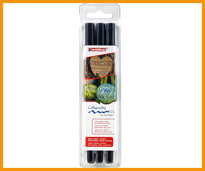 Edding 1255 on viistolla kuitukärjellä varustettu kalligrafiakynä. Vesipohjainen ja pysyvä pigmenttimuste kestää sekä vettä että haalistumista.Musteen väri: musta