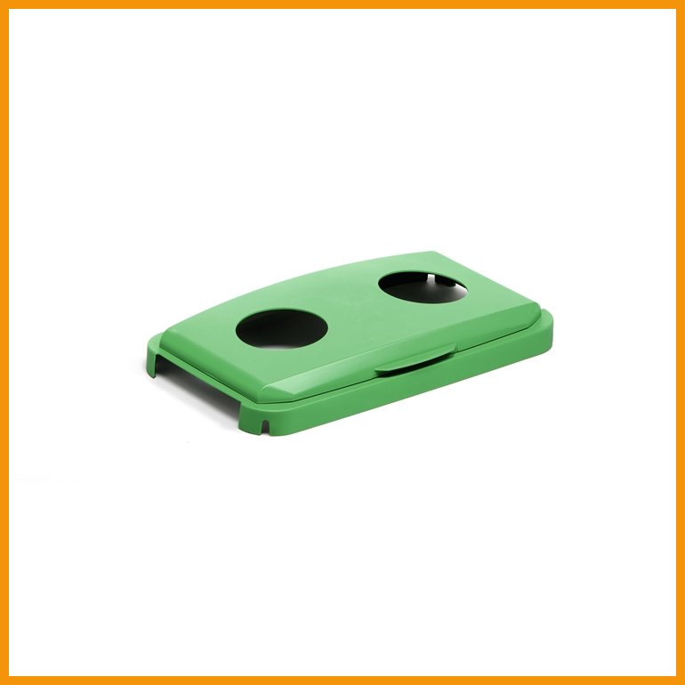 60 litran Durabin-jäteastian kansi kauluksella ja kahdella reiällä tölkkien ja pullojen lajittelua varten. Muovinen kansi on helppo napsauttaa paikoilleen. Tuote on elintarviketurvallinen.Mitat: 510 x 285 x 73 mm