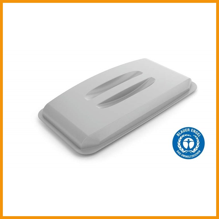 Suorakulmainen, uritetulla kahvalla varustettu kansi Durabin ECO -jäteastiaan.Tuote on valmistettu vähintään 80-prosenttisesti kierrätysmuovista ja sillä on saksalainen Blue Angel -ympäristösertifikaatti.