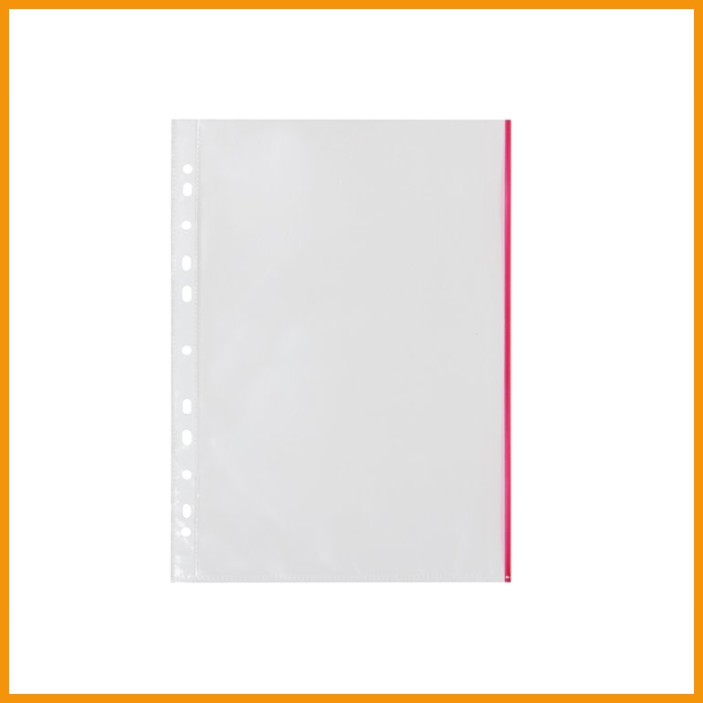Q-CONNECTin ylhäältä auki oleva ja värillisellä reunuksella viimeistelty kansiotasku on läpinäkyvä, heijastamaton ja kirkaspintainen. Arkistokelpoisen taskun valkoisessa reunalistassa on yleisrei'itys.Koko: A4