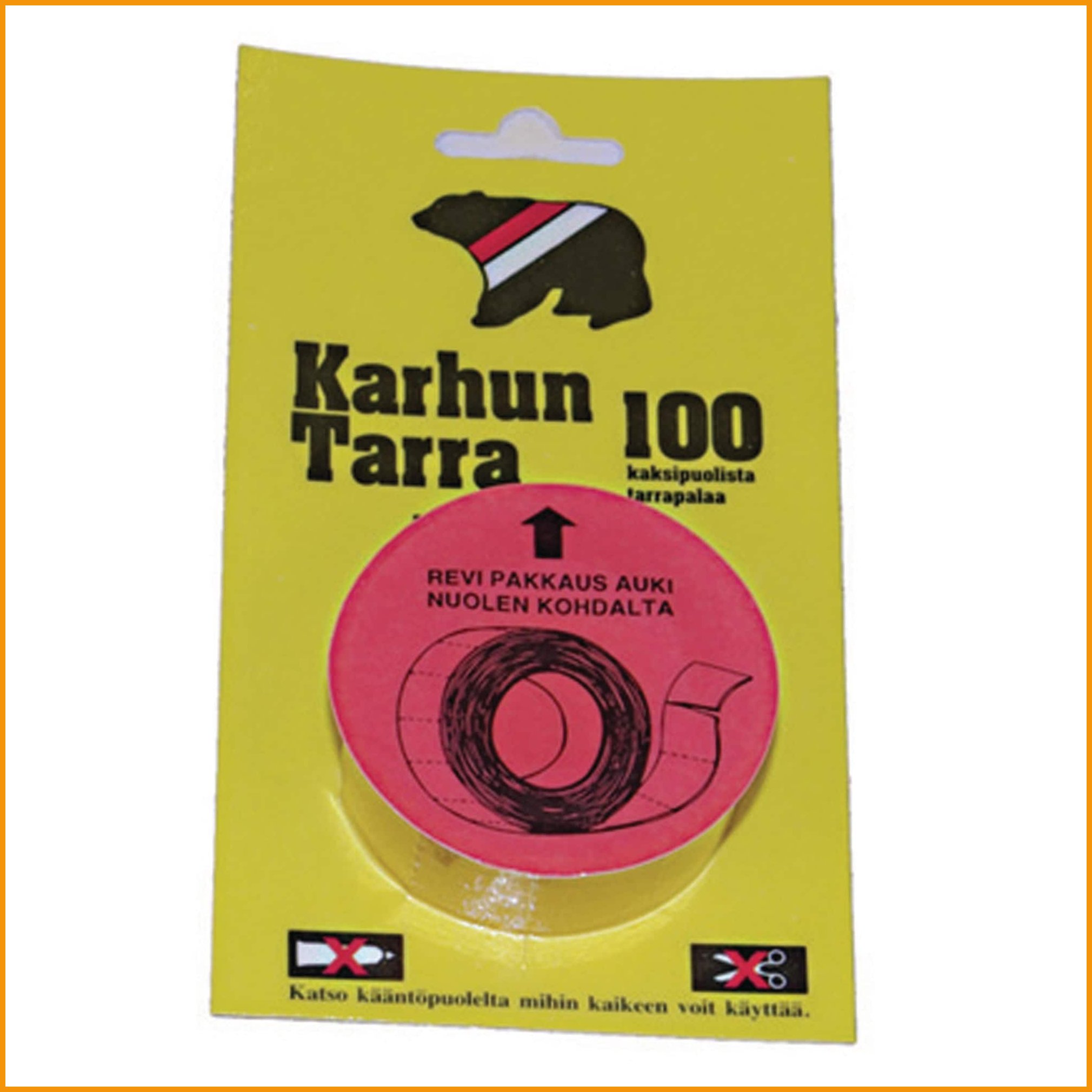 Karhuntarra 20x25mm pakkauksessa 100 kpl valmiiksi leikattua karhuntarraa. Tarra tarttuu heti muoviin, keramiikkaan, lasiin, metalliin ,jne. Karhuntarralla kiinnittyy kyltit, julisteet, taulut ja seinäkoukut näppärästi, ei ole tarkoitettu huokoisiin pintoihin.