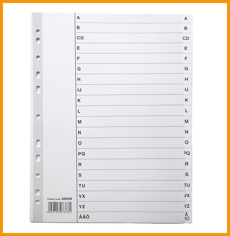 Kartonki Aakkosvälilehti A4 A-Ö on hyvälaatuinen toimistotarvike, jonka verkkokauppatilauksen toimitus perille kestää 1-2 päivää. Muistathan, että Toimitus on ilmainen kaikilla verkkokaupan ostoksilla, joiden hinta on yli 140 €. Meiltä voit tilata laskulla ja ilman rekisteröitymistä.