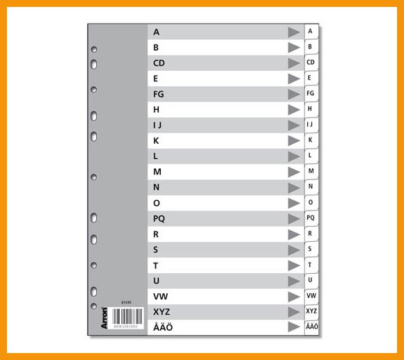 20-jakoisessa aakkoshakemistossa on valkoiset kartonkiset (120 g) lehdet sekä kirjaimin A-Ö painettu etusivu ja kielekkeet. FSC-sertifioidusta materiaalista valmistetussa hakemistossa on yleisrei'itys. Tuotteessa ei ole ylimääräisiä muovikääreitä.Koko: A4.