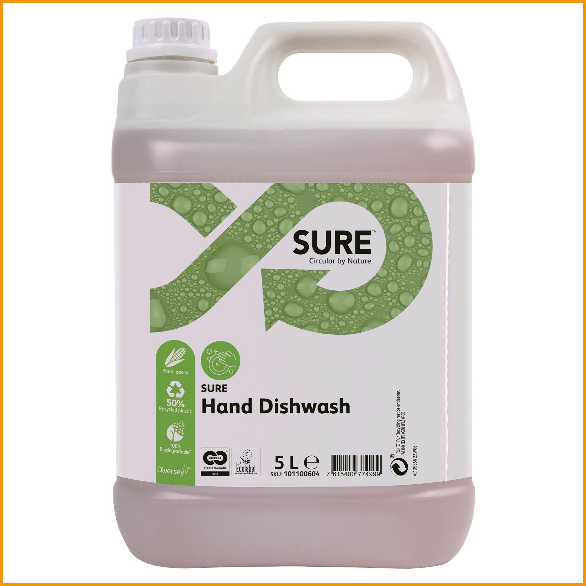 SURE Käsiastianpesuaine on osa ainutlaatuista kasvipohjaista, 100% biohajoavaa ammattikäyttöön tarkoitettua tuotesarjaa. SURE Käsiastianpesuaine on tiivistetty astianpesuaine kaikenlaisten astioiden ja keittiövälineiden käsin suoritettavaan pesuun. Ympäristömerkitty (EU-kukka) Kaikenlaisten astioiden ja keittiövälineiden käsin suoritettavaan pesuun. Ei sisällä hajusteita tai väriaineita. Vähemmän vaahtoa, soveltuu myös astioiden liotukseen ennen astianpesukoneeseen laittoa. Ei sisällä käyttäjälle tai luonnolle vaarallisia luokituksia. Valmistettu uusiutuvista, luonnon omista raaka-aineista. 100 % biohajoava. Tiivistetty tuote on taloudellinen käytössä. Tunkeutuu rasvaan ja kiinni kuivuneeseen likaan. Huuhtoutuu helposti eikä jätä raitoja.Käsiastianpesuaine Sure hand dishwash 5l on hyvä tiskinpesuaine, jonka toimituksen kesto on verkkokaupasta tilattuna 1-2 päivää. Tiedäthän, että Toimitus on ilmainen kaikilla verkkokaupan ostoksilla, joiden hinta on yli 140 €. Meiltä voit tilata laskulla ja ilman rekisteröitymistä.