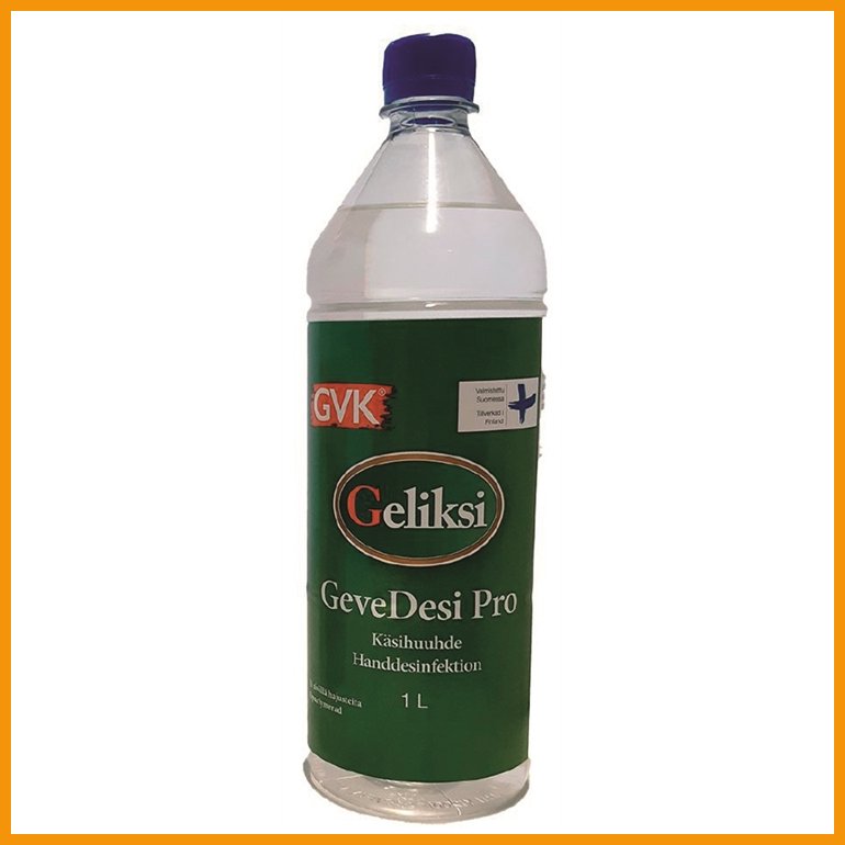Geliksi GeveDesi on kotimainen, hajusteeton ja väriaineeton käsidesi. Helposti levittyvä ja nopeasti kuivuva desinfioiva etanolipohjainen käsihuuhde sisältää ihoa hoitavaa glyserolia. Tuote ei aiheuta värjäytymiä pinnoille eikä tekstiileihin.Kierrekorkilla varustetu täyttöpullon korkkiin voit halutessasi napauttaa pienen reiän naulalla ja vasaralla (tai nuppineulalla/nastalla), jolloin korkkia ei tarvitse avata käytettäessä.