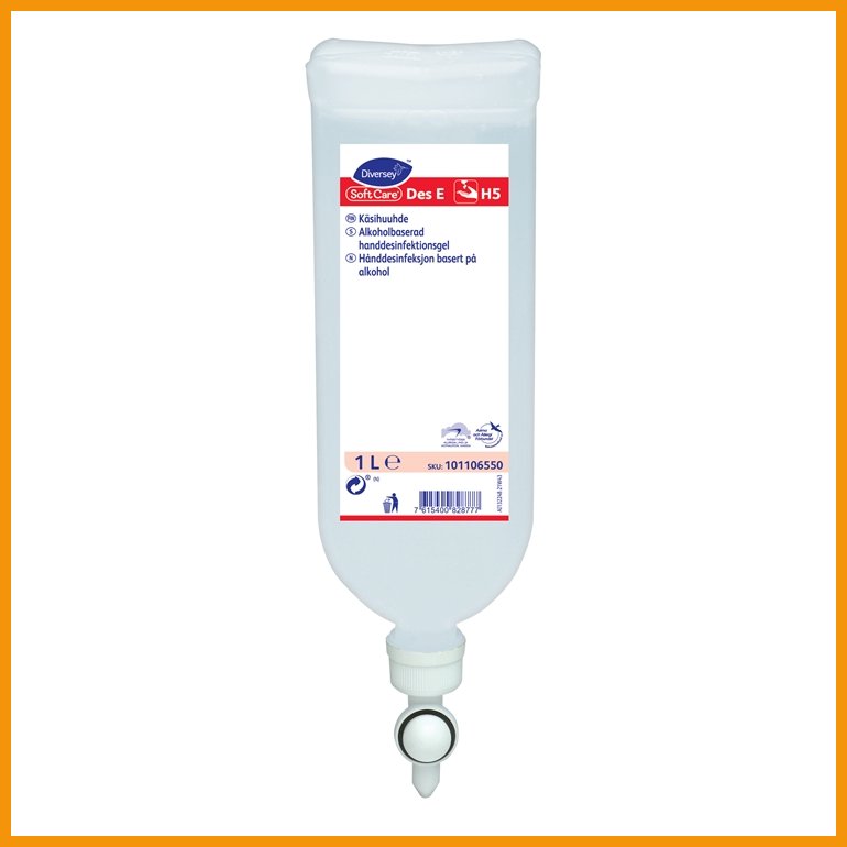 Diversey Soft Care Des E on alkoholipohjainen desinfiointiaine käsien kirurgiseen desinfektioon. Hajusteeton ja väriaineeton tuote soveltuu kaikenlaisille aloille, kuten terveydenhuoltoon ja elintarviketeollisuuteen. Käsihuuhde on erittäin tehokas resistenttejä ja transienttejä flooraa, kuten bakteerit (esim. MRSA) ja hiivat, sekä vaipallisia viruksia, kuten influenssaa, ja tiettyjä vaipattomia viruksia, kuten Norovirus ja Adenovirus, vastaan.Hellävaraisella tuotteella on Allergia-, Iho- ja Astmaliiton tunnus.