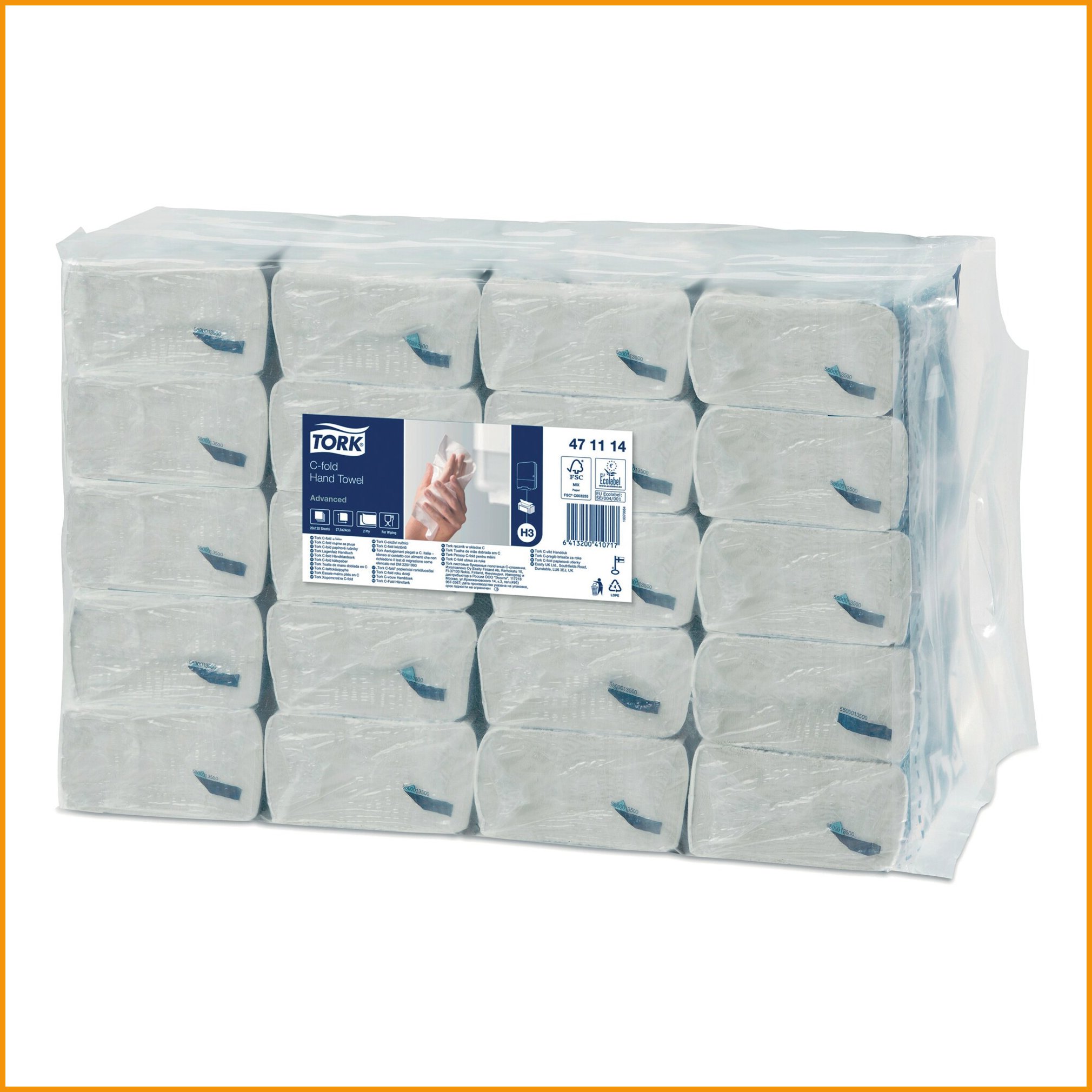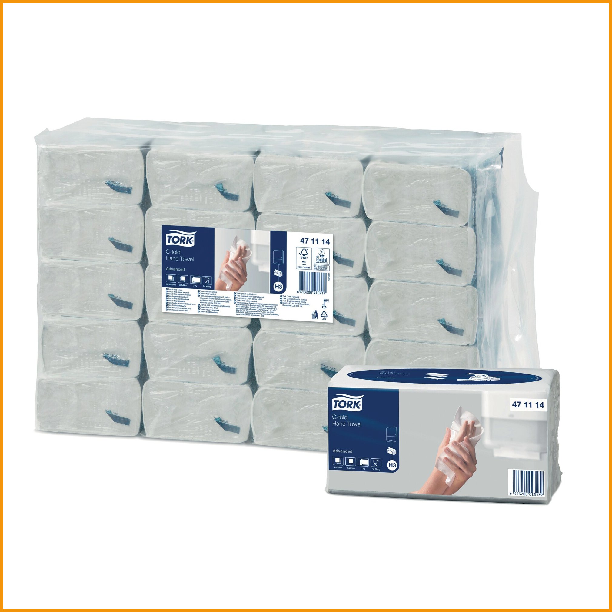 Tork 471114 Advanced H3 C-taitto käsipaperi tarjoaa toimivuutta ja kustannustehokkuutta samassa paketissa. Taitettu käsipaperi on ihanteellinen vaihtoehto esimerkiksi julkisiin saniteettitiloihin. Laadukas, kaksikerroksinen paperi on imukykyistä ja pehmeää. Paperi on väriltään valkoinen ja kohokuvioitu. Yksittäisen arkin koko on 31 x 24,8 cm. Käsipaperi on valmistettu kuitusekoituksesta, joka sisältää kierrätyskuitua ja ensikuitua. Se on huolellisesti suunniteltu noudattamaan tiukkoja hygieniavaatimuksia, ja sen käyttö elintarvikkeiden käsittelyssä on turvallista. Ympäristöystävällisellä tuotteella on EU-ympäristömerkki, FSC® -sertifikaatti sekä Avainlippu: Tehty Suomessa. Tork 471114 Advanced -käsipaperi on suunniteltu yhteensopivaksi H3-annostelijan kanssa. Valmistajan tuotekoodi: 471114 C-taitto 2-kerroksinen Annostelija: H3 Koko: 31 x 24,8 cm Valkoinen, kohokuvioitu EU-ympäristömerkki, FSC-sertifikaatti sekä Avainlippu Elintarvikehyväksytty Valmistettu sekalaisesta kuidusta Myyntierä 1 kpl = 20 pakkausta. Yhdessä pakkauksessa 120 arkkia. Myyntierässä 2400 arkkia. Lava = 32 kpl x 20 pakkausta.Käsipaperit toimitetaan 120 kappaleen erissä.