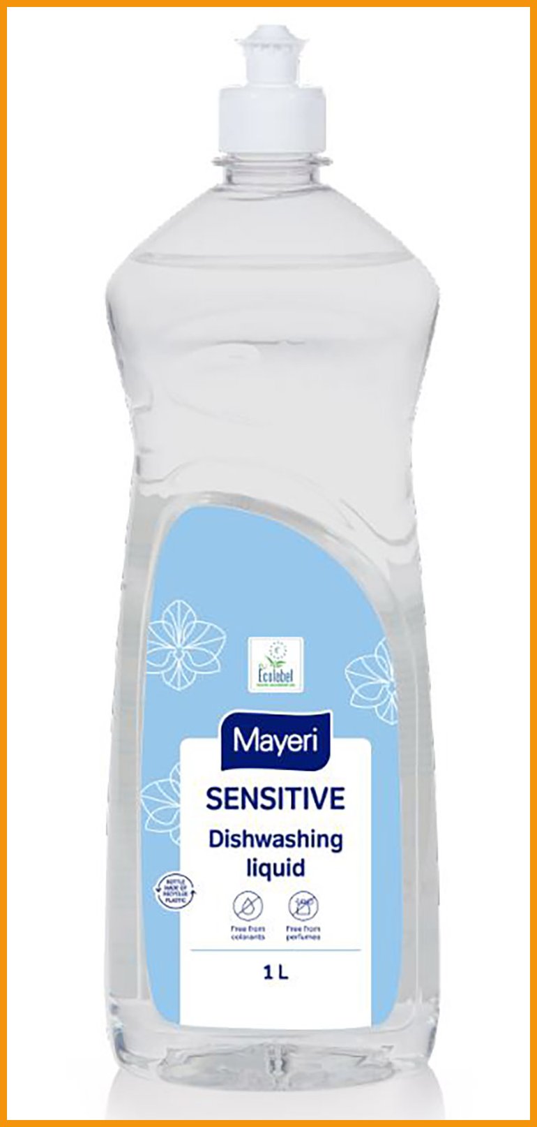 Mayeri Sensitive on hajusteeton ja väriaineeton käsitiskiaine, joka poistaa tehokkaasti rasvaa ja likaa myös viileässä ja kovassa vedessä ja jättää lasit, astiat ja ruokailuvälineet kiiltäviksi ja tahrattomiksi. Tuote on dermatologisesti testattu ja hyväksytty.Tuotteella on EU Ecolabel -ympäristösertifikaatti.