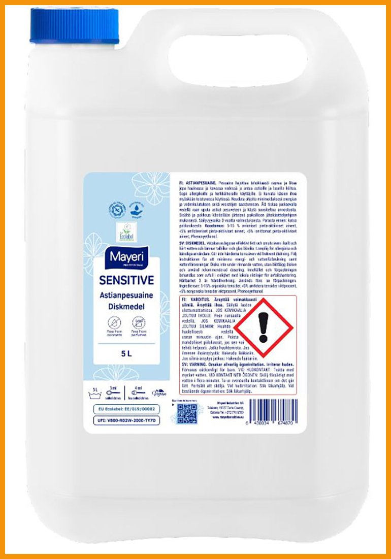 Mayeri Sensitive on hajusteeton ja väriaineeton käsitiskiaine, joka poistaa tehokkaasti rasvaa ja likaa myös viileässä ja kovassa vedessä ja jättää lasit, astiat ja ruokailuvälineet kiiltäviksi ja tahrattomiksi. Tuote on dermatologisesti testattu ja hyväksytty.Tuotteella on EU Ecolabel -ympäristösertifikaatti.