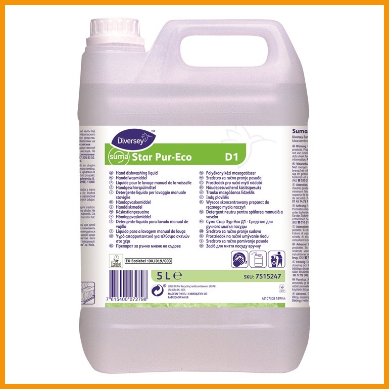 Suma Star Pur-Eco D1 on tehokas astianpesu- ja yleispuhdistusaine käsin suoritettavaan astianpesuun ja kaikkien vettä sietävien kovien pintojen puhdistukseen. Tiivistetty ja neutraali pesuaine sisältää anionisia, amfoteerisiä ja ionittomia pinta-aktiivisia aineita, jotka tunkeutuvat rasvaan ja kiinni kuivuneeseen likaan. Pesuaine huuhtoutuu helposti eikä jätä astioihin raitoja.Tuotteella on EU Ecolabel -ympäristösertifikaatti.