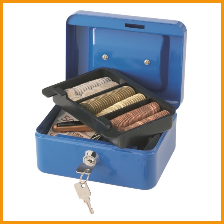 Q-CONNECTin teräksisen kassalippaan sisällä on irrotettava muovinen lokerikko kolikoita varten. Tukevassa lippaassa on kantokahva ja 2 avainta.Mitat: 255 x 200 x 90 mm