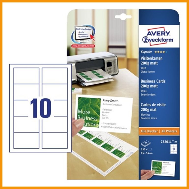Averyn käyntikorttiarkeilla luot ammattimaiset käyntikortit itse. Mattapintaiset ja yksipuoliset arkit soveltuvat niin kopiointiin kuin sekä laser- että mustesuihkutulostukseenkin ilman tukoksia tai mustetahroja.