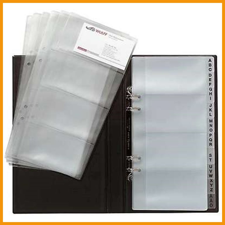 Käyntikorttikansiossa on 20 taskua yhteensä 160 kortille. Korttitaskut on aakkostettu järjestelmällisen arkistoinnin helpottamiseksi. Kovat kannet ovat nahkajäljiteltyä martioitua muovia. Lisätaskuja on saatavanana tuotenumerolla 200422.Väri: musta.