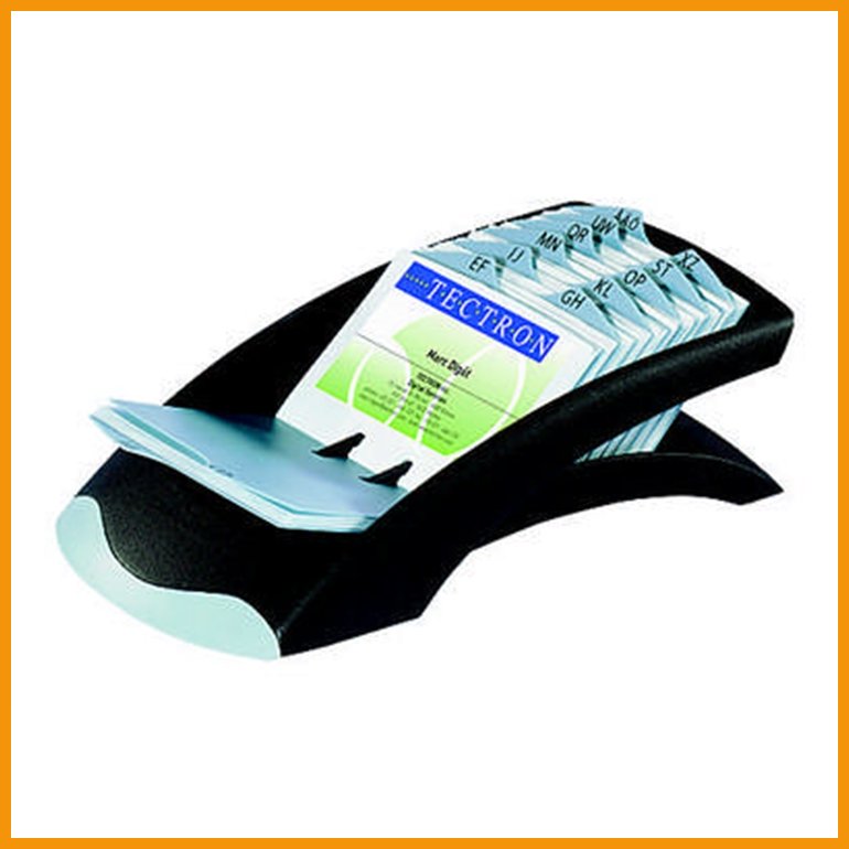 Durable Visifix -käyntikorttiselailutelineessä on 100 korttitaskua, joista jokaiseen mahtuu kaksi käyntikorttia. Teline on aakkostettu järjestelmällisen arkistoinnin helpottamiseksi. Kortin enimmäiskoko on 72 x 104 mm.Mitat: 245 x 131 x 67 mm.
