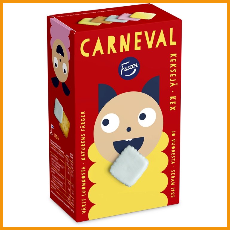 Suussa sulavalla kuorrutteella päällystetyt Fazer Carneval -keksit ovat ilahduttaneet juhlakansaa jo vuodesta 1925, eikä suosiolle näy loppua. Myös vegaaniseen ruokavalioon soveltuvien keksien kauniit värit ovat peräisin aidosta luonnosta. Kotimaisella tuotteella on Avainlippu-tunnus.Sisältö: 175 g.