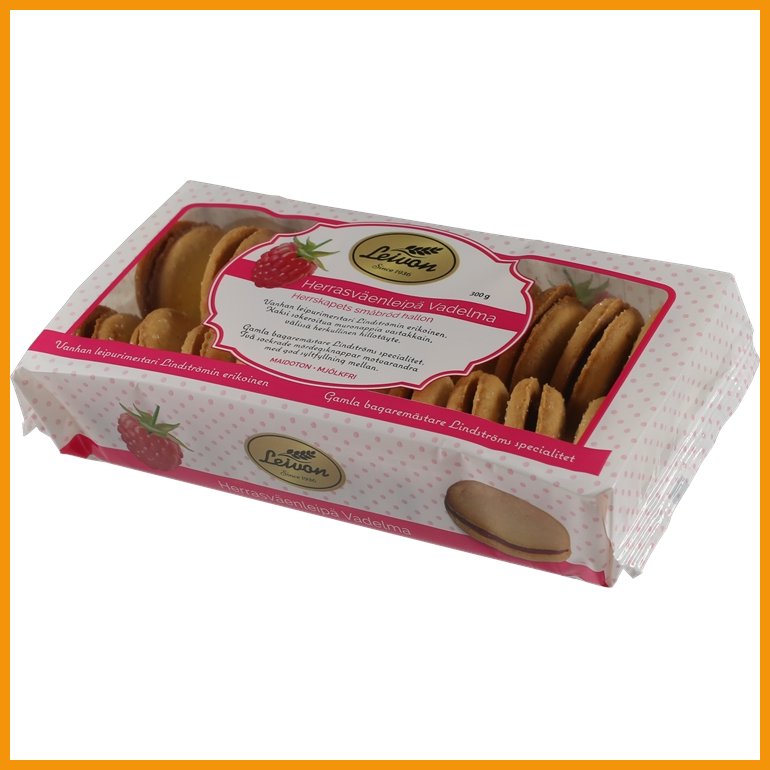 Leivon Herrasväenleivässä on kaksi sokeroitua, maidotonta muronappia vastakkain ja niiden välissä on herkullinen vadelmatäyte. Leivon keksit leivotaan Vetelissä.Sisältö: 300 g.