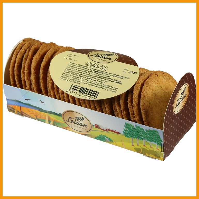 Leivon kauralastu on legendaarinen, runsaasti kauraa sisältävä maidoton pikkuleipä. Leivon keksit leivotaan Vetelissä.Sisältö: 250 g .