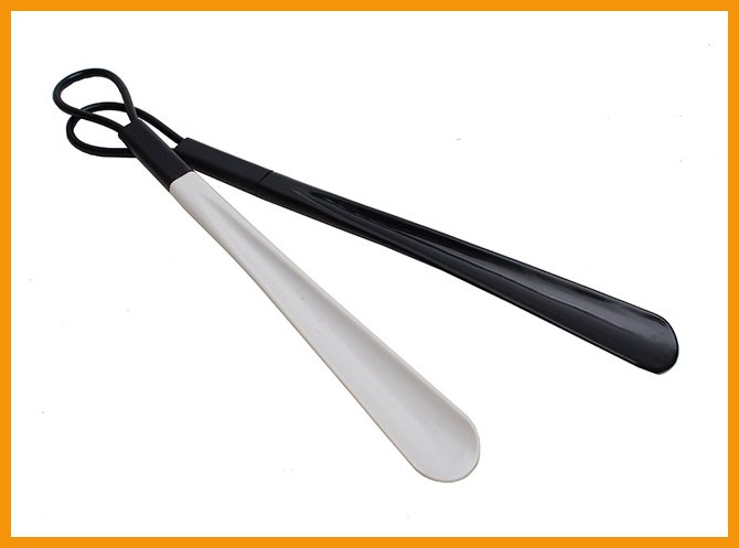 Muovinen kenkälusikka ripustuslenkillä.Pituus: 49 cm.