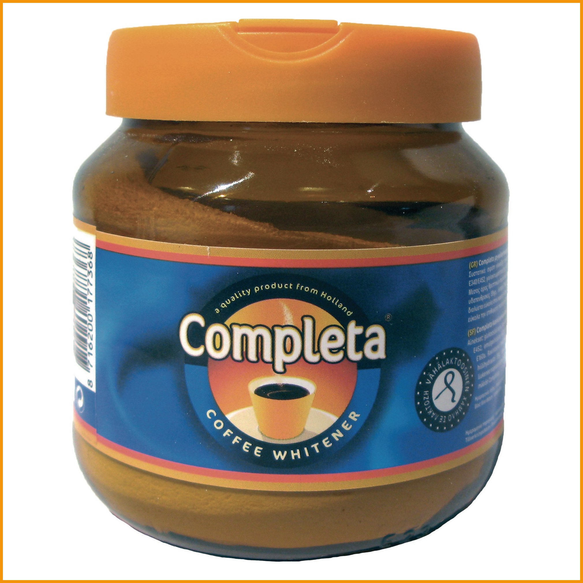 Completa kermajauhe on valkoista jauhetta, joka liukenee nopeasti kahviin ja teehen ja antaa juomaan maidon makua. tuote on vähälaktoosinen. kestävässä lasipurkissa, jossa kätevä annostelukansi. myyntierä: 1 prk.Kermajauhe Completa 200g on mainio toimistotarvike, jonka verkkokaupan tilauksen toimitus kestää 1-2 päivää. Tiedäthän, että ilmainen toimitus on kaikilla yli 140 € hintaisilla tilauksilla! Meiltä voit tilata laskulla ja ilman rekisteröitymistä.