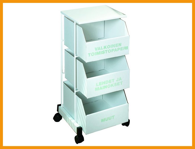 Ecosort-kierrätyslaatikosto helpottaa paperin lajittelua ja kierrättämistä. Setissä on valkoinen metalliteline ja pahvilaatikot kolmelle jakeelle: valkoiselle toimistopaperille, lehdille ja mainoksille sekä muulle paperille.