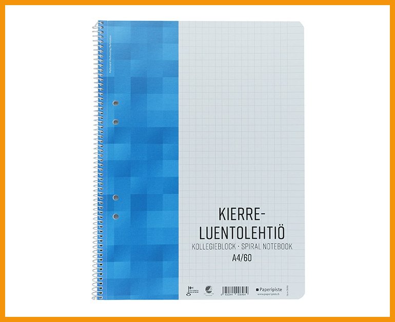 Paperipisteen kierresidotussa luentolehtiössä on paksusta kartongista valmistettu tukeva pohja. Puuvapaasta paperista valmistetut, ruudutetut (7x7 mm) ja yleisrei´itetyt (8-12 cm) sivut valmiilla marginaaleilla.Kotimaisella ja kestävästi valmistetulla Kotimaisella tuotteella on pohjoismainen Joutsenmerkki ja Avainlippu.