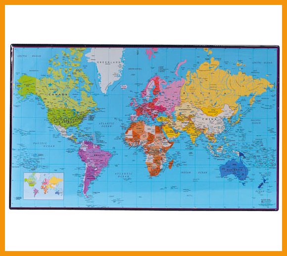 Kirjoitusalusta, jonka pintaan on painettu maailmankartta ja aikavyöhykkeet.Mitat: 36,5 x 59,5 cm