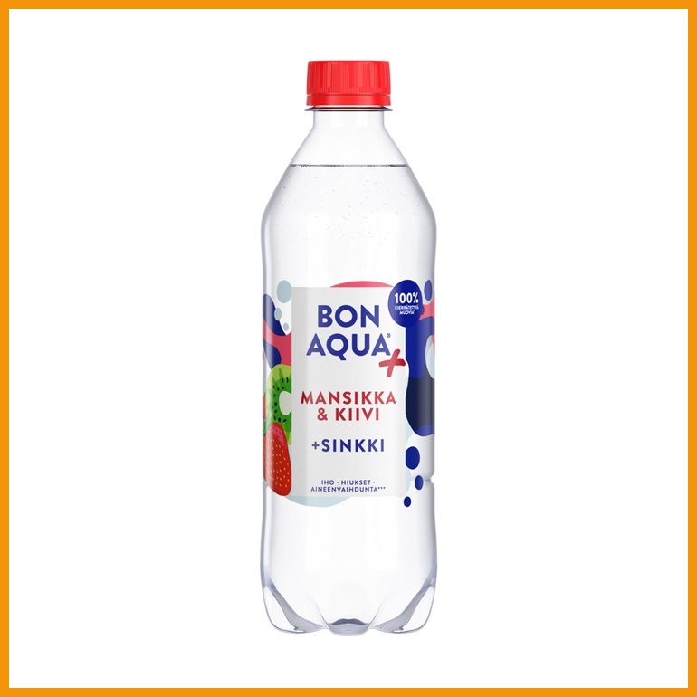 Bonaqua+ Mansikka & Kiivi on hiilihapotettu, mansikan ja kiivin makuinen kivennäisvesi. Vähäkalorinen juoma on makeutettu kevyesti hedelmäsokerilla ja sammuttaa janon terveellisesti. Juomaan on lisätty sinkkiä eikä siinä ole lainkaan suolaa.Sisältö: 0,5 litraa