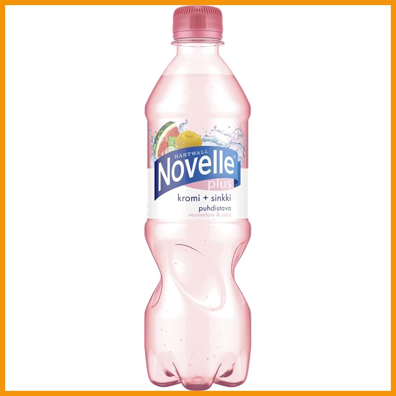 Hartwallin Novelle Plus Kromi + Sinkki on vesimelonin ja yuzun makuinen matalahiilihappoinen ja vähäkalorinen virvoitusjuoma. Etenkin verensokerin normaalia tasoa ylläpitävään juomaan on lisätty kromia, sinkkiä ja niasiinia.Pakkauksessa on 24 pulloa á 0,5 litraa. Hinta ei sisällä panttia.