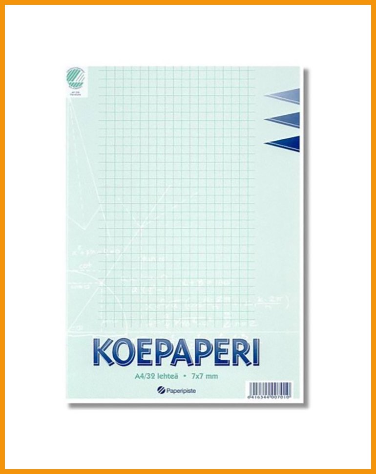 Paperipisteen koepaperi tai konseptipaperi on puuvapaasta materiaalista valmistettu taitettu A3 ruudutuksella (7 x 7 mm).Kotimaisella tuotteella on pohjoismainen Joutsenmerkki ja Avainlippu.