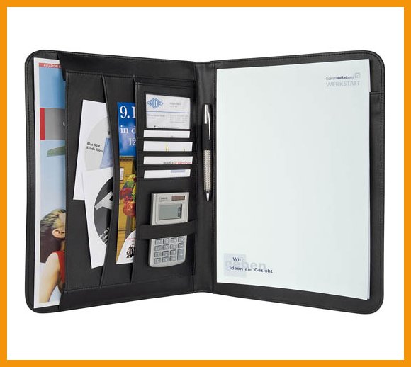Wedo Elegance on monipuolinen, tyylikkään mustalla keinonahkalla ja nylonilla päällystetty kokouskansio. Kansiossa on mm. kynäpidike, paikka A4-kokoiselle lehtiölle, tilaa niinikään A4-kokoisille papereille, kaksi erillistä taskua kokousmateriaalille, 4 taskua käyntikorteille, ikkunatasku sekä kumilenkkipidike laskimelle.Mitat: 33 x 3 x 25 cm.