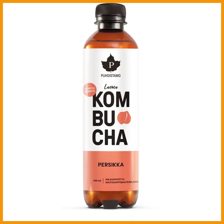 Puhdistamon Kombucha on maustettu mehevällä persikalla. Italialaiseen mineraaliveteen fermentoidussa teepohjaisessa juomassa on runsaasti maitohappobakteereita. Pastöroimattomassa luomujuomassa on juuri oikea määrä hiilihappoja raikkaan maun takaamiseksi. Luomujuoma on lisä- ja säilöntäaineeton.