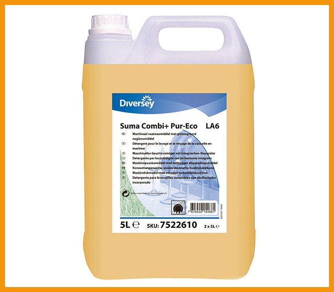 Suma Combi+ Pur-Eco LA6 on nestemäinen koneastianpesuaine, jossa on sekä pesuainetiiviste että huuhtelukirkaste yhdessä. Voimakkaasti emäksinen aine sisältää runsaasti kompleksinmuodostajia, jotka irrottavat tehokkaasti rasvalikaa ja ehkäisevät kalkkisaostumien syntymistä kaikenkovuisissa vesissä. Erillistä huuhtelukirkastetta ei tarvita.Pakkauskoko: 5 litraa