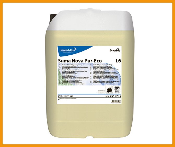 Diverseyn Suma Nova Pur-Eco L6 on vahvasti emäksinen nestemäinen pesuainetiiviste astioiden konepesuun. Emäksisen koostumuksen ja runsaiden kompleksinmuodostajien ansiosta tuote irrottaa tehokkaasti rasvaa ja kuivunutta likaa sekä estää kalkkisaostumien muodostumisen astianpesukoneeseen myös kovissa vesissä.Tuottella on EU Ecolabel -ympäristösertifikaatti.