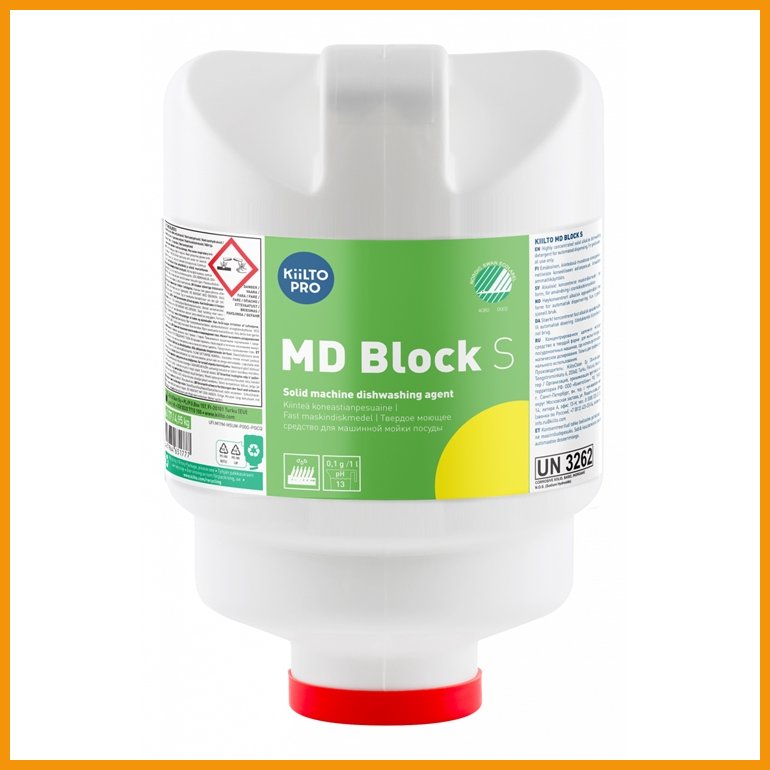 Kiilto Pro MD Block S on vahvasti emäksinen pesuainetiiviste koneelliseen astioiden pesuun ammattikäytössä. Pehmeisiin ja keskikoviin vesiin soveltuva aine on kiinteässä muodossa, josta sitä liotetaan vesisuihkulla ja annostellaan turvallisesta ja kätevästä kasettipakkauksesta suoraan astianpesukoneen pesutankkiin. Annostellaan Whiteline MD Dispenser -annostimella, jolloin annostelutarkkuus on huippuluokkaa.Tuotteella on pohjoismainen Joutsenmerkki.